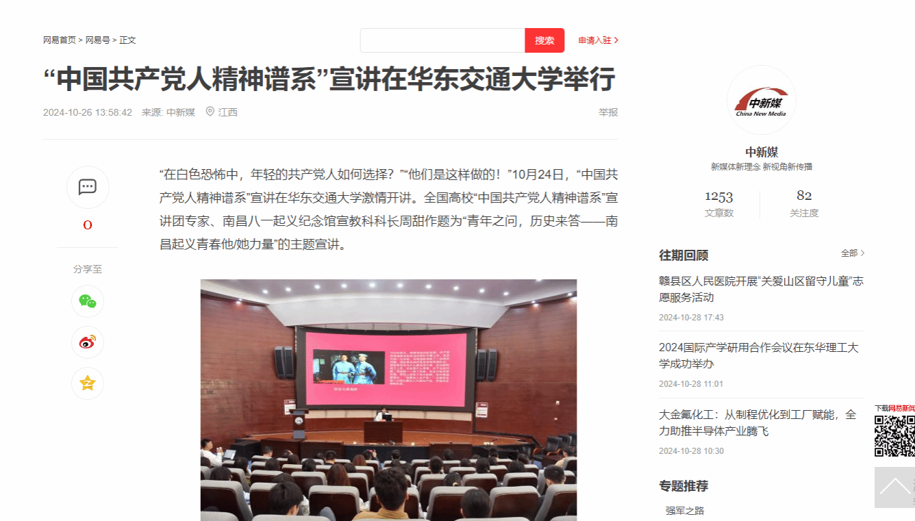 “在白色恐怖中,年輕的共產黨人如何選擇?”“他們是這樣做的!”10月24日,“中國共產黨人精神譜系”宣講在華東交通大學激情開講。全國高校“中國共產黨人精神譜系”宣講團專家、南昌八一起義紀念館宣教科科長周甜作題為“青年之問,歷史來答——南昌起義青春他/她力量”的主題宣講。