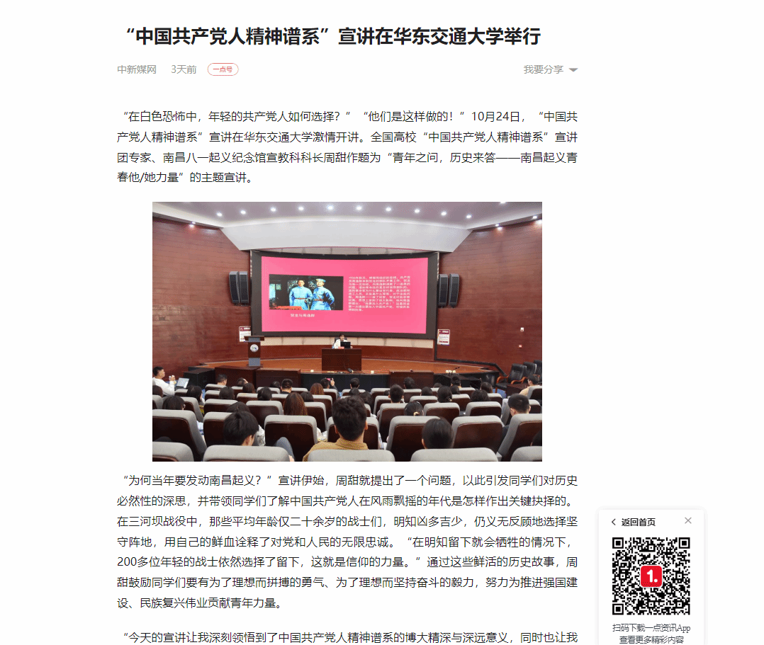 “在白色恐怖中,年輕的共產黨人如何選擇?”“他們是這樣做的!”10月24日,“中國共產黨人精神譜系”宣講在華東交通大學激情開講。全國高校“中國共產黨人精神譜系”宣講團專家、南昌八一起義紀念館宣教科科長周甜作題為“青年之問,歷史來答——南昌起義青春他/她力量”的主題宣講。