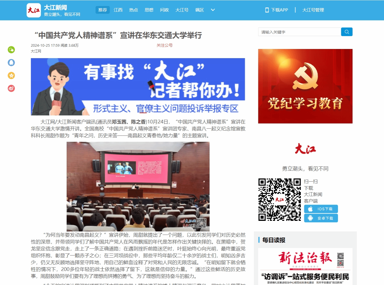 10月24日,“中國共產黨人精神譜系”宣講在華東交通大學激情開講。全國高校“中國共產黨人精神譜系”宣講團專家、南昌八一起義紀念館宣教科科長周甜作題為“青年之問,歷史來答——南昌起義青春他/她力量”的主題宣講。