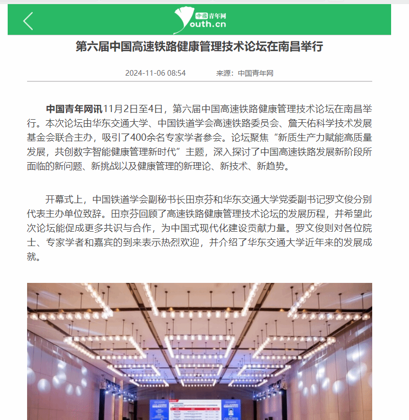 11月2日至4日,第六屆中國高速鐵路健康管理技術(shù)論壇在南昌舉行。本次論壇由華東交通大學(xué)、中國鐵道學(xué)會高速鐵路委員會、詹天佑科學(xué)技術(shù)發(fā)展基金會聯(lián)合主辦,吸引了400余名專家學(xué)者參會。論壇聚焦“新質(zhì)生產(chǎn)力賦能高質(zhì)量發(fā)展,共創(chuàng)數(shù)字智能健康管理新時(shí)代”主題,深入探討了中國高速鐵路發(fā)展新階段所面臨的新問題、新挑戰(zhàn)以及健康管理的新理論、新技術(shù)、新趨勢。