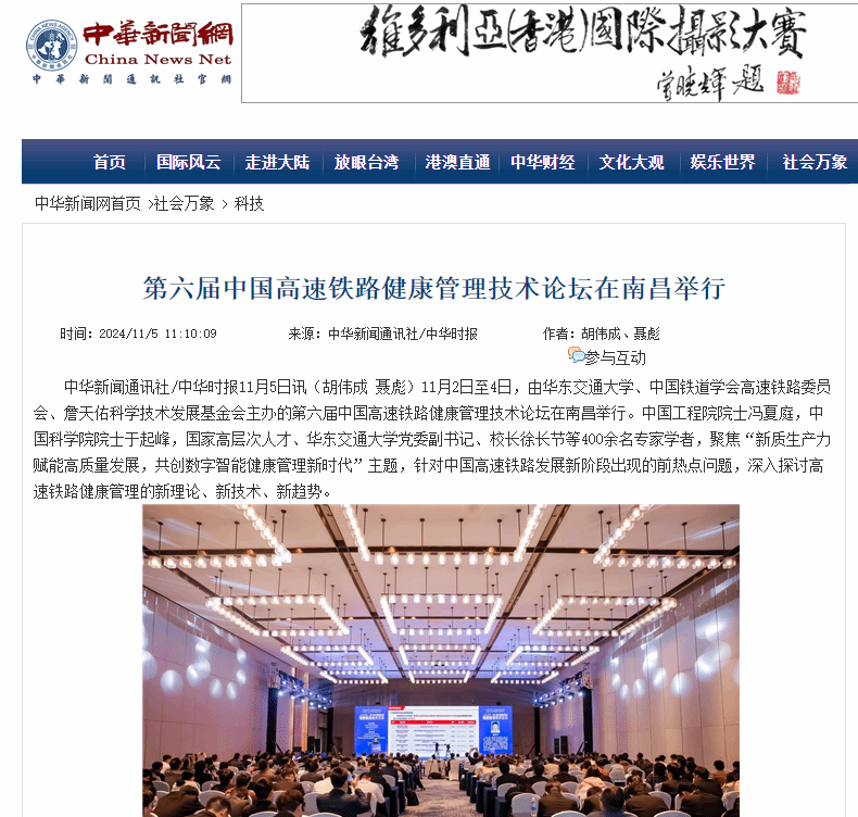 11月2日至4日,由華東交通大學、中國鐵道學會高速鐵路委員會、詹天佑科學技術發展基金會主辦的第六屆中國高速鐵路健康管理技術論壇在南昌舉行。中國工程院院士馮夏庭,中國科學院院士于起峰,國家高層次人才、華東交通大學黨委副書記、校長徐長節等400余名專家學者,聚焦“新質生產力賦能高質量發展,共創數字智能健康管理新時代”主題,針對中國高速鐵路發展新階段出現的前熱點問題,深入探討高速鐵路健康管理的新理論、新技術、新趨勢。