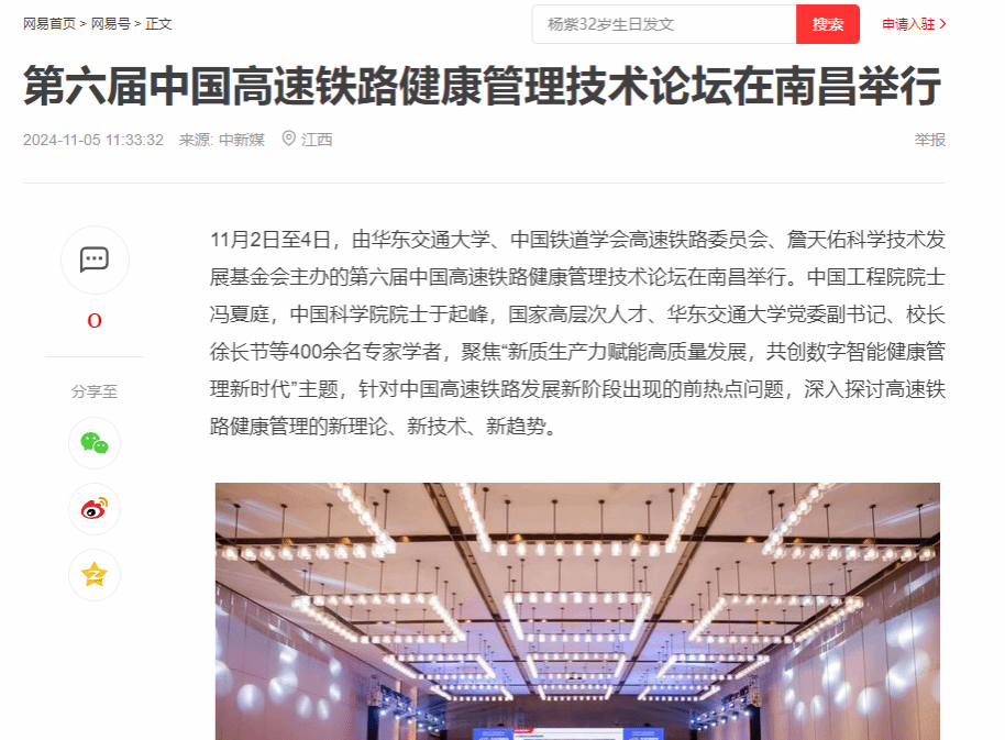 11月2日至4日,由華東交通大學(xué)、中國鐵道學(xué)會高速鐵路委員會、詹天佑科學(xué)技術(shù)發(fā)展基金會主辦的第六屆中國高速鐵路健康管理技術(shù)論壇在南昌舉行。中國工程院院士馮夏庭,中國科學(xué)院院士于起峰,國家高層次人才、華東交通大學(xué)黨委副書記、校長徐長節(jié)等400余名專家學(xué)者,聚焦“新質(zhì)生產(chǎn)力賦能高質(zhì)量發(fā)展,共創(chuàng)數(shù)字智能健康管理新時代”主題,針對中國高速鐵路發(fā)展新階段出現(xiàn)的前熱點問題,深入探討高速鐵路健康管理的新理論、新技術(shù)、新趨勢。