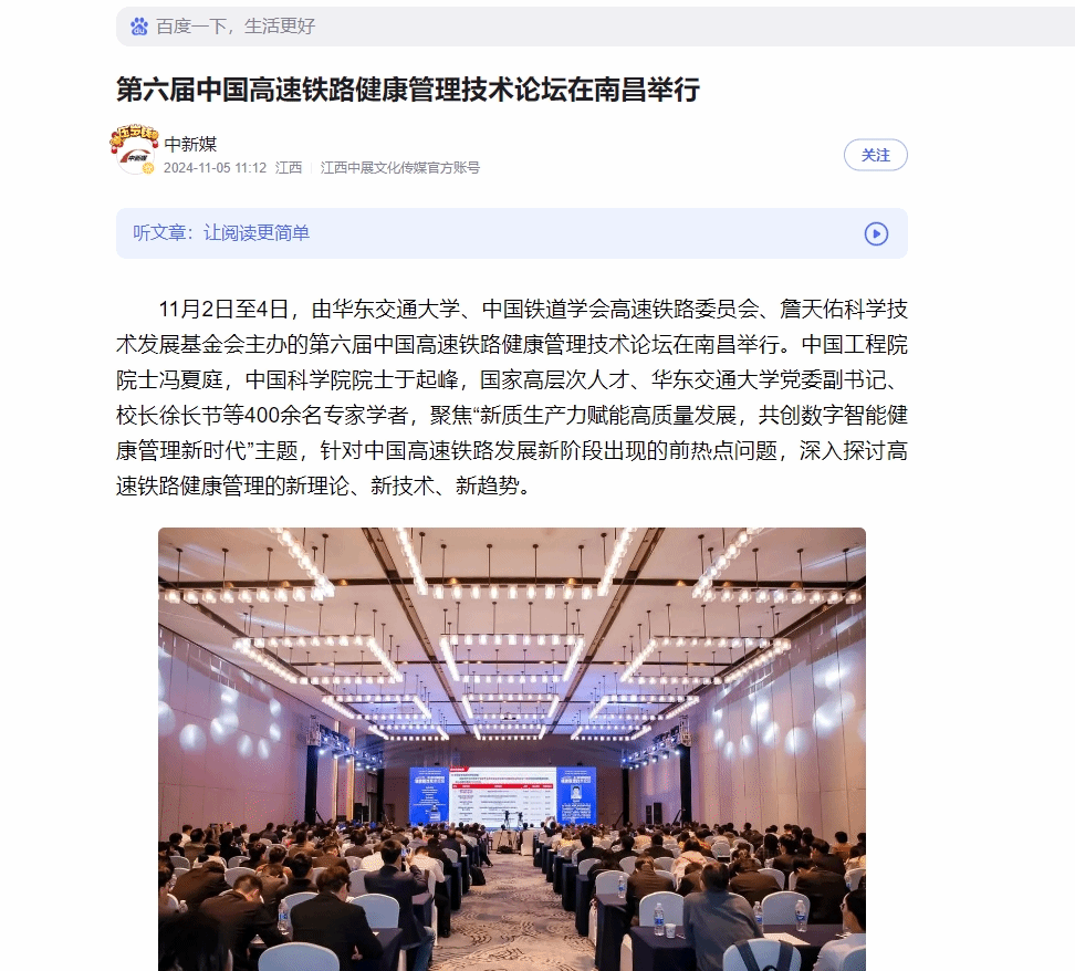 11月2日至4日,由華東交通大學、中國鐵道學會高速鐵路委員會、詹天佑科學技術發展基金會主辦的第六屆中國高速鐵路健康管理技術論壇在南昌舉行。中國工程院院士馮夏庭,中國科學院院士于起峰,國家高層次人才、華東交通大學黨委副書記、校長徐長節等400余名專家學者,聚焦“新質生產力賦能高質量發展,共創數字智能健康管理新時代”主題,針對中國高速鐵路發展新階段出現的前熱點問題,深入探討高速鐵路健康管理的新理論、新技術、新趨勢。