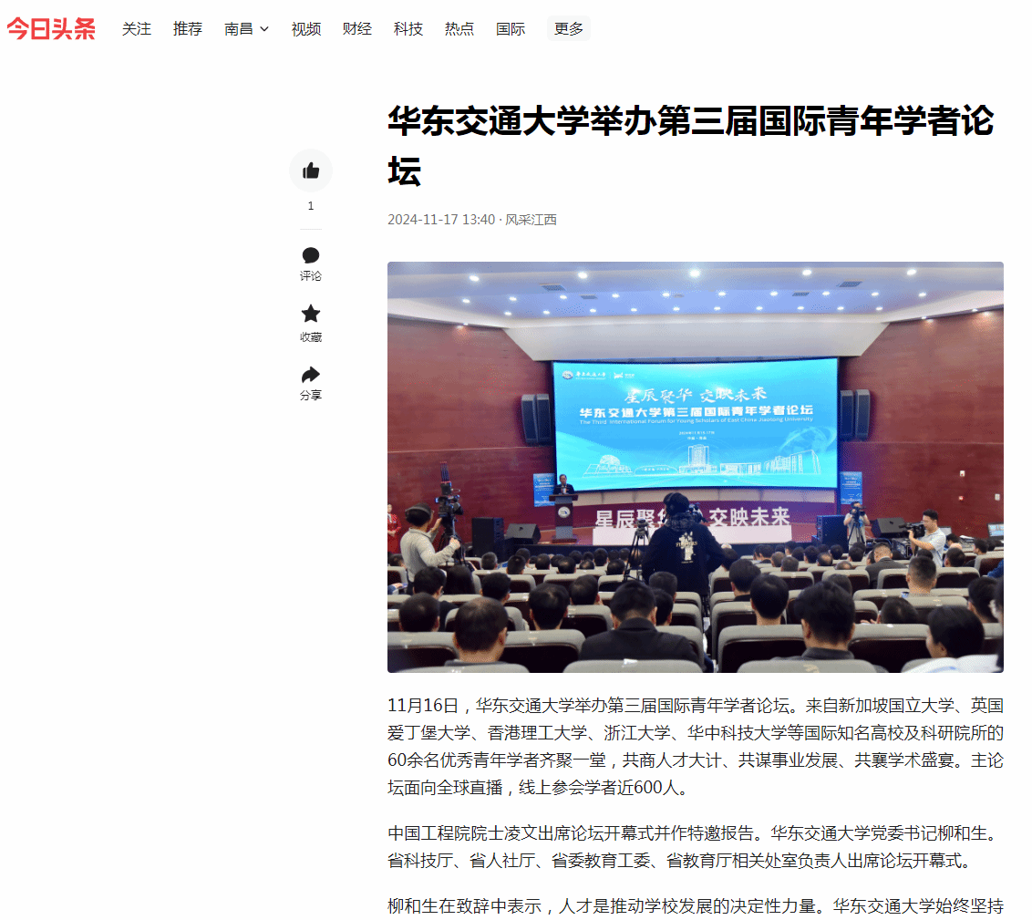 11月16日,華東交通大學舉辦第三屆國際青年學者論壇。來自新加坡國立大學、英國愛丁堡大學、香港理工大學、浙江大學、華中科技大學等國際知名高校及科研院所的60余名優秀青年學者齊聚一堂,共商人才大計、共謀事業發展、共襄學術盛宴。主論壇面向全球直播,線上參會學者近600人。