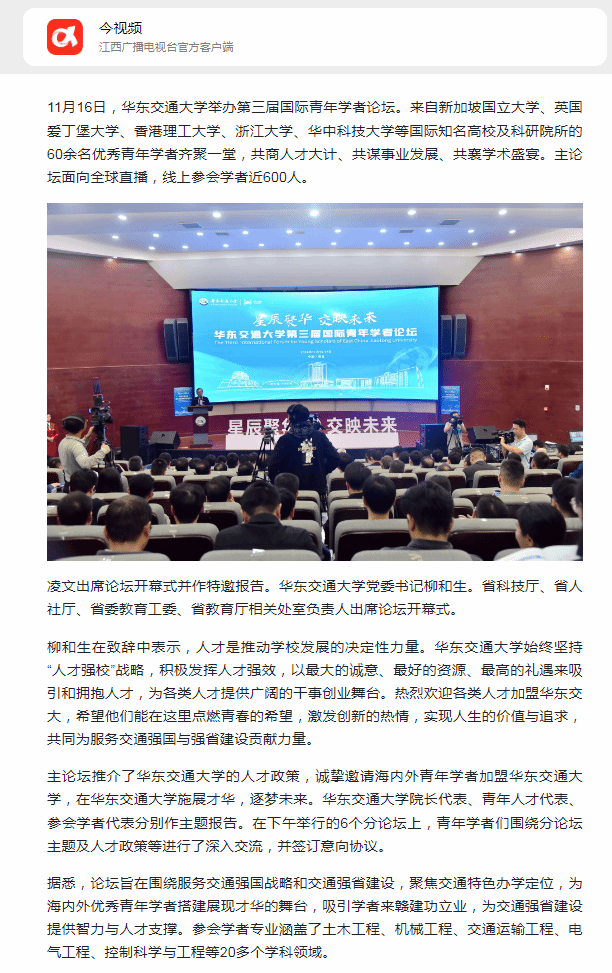 11月16日,華東交通大學舉辦第三屆國際青年學者論壇。來自新加坡國立大學、英國愛丁堡大學、香港理工大學、浙江大學、華中科技大學等國際知名高校及科研院所的60余名優秀青年學者齊聚一堂,共商人才大計、共謀事業發展、共襄學術盛宴。主論壇面向全球直播,線上參會學者近600人。