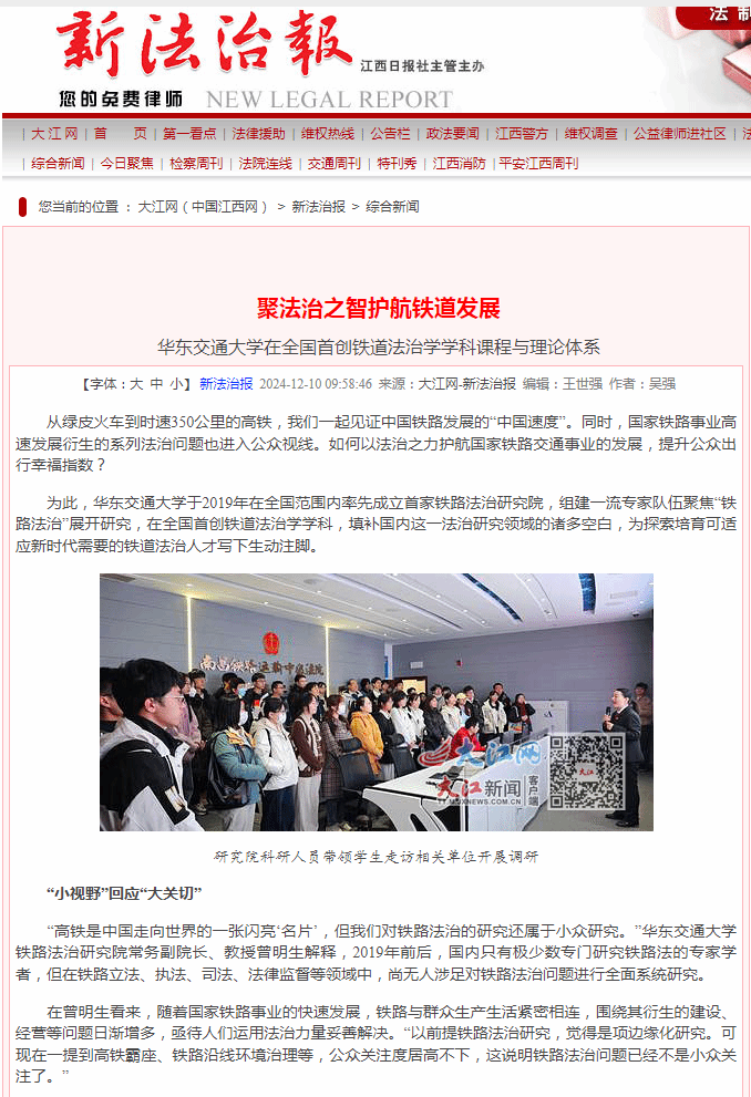華東交通大學(xué)在國(guó)內(nèi)高校中另辟蹊徑,整合校內(nèi)外相關(guān)領(lǐng)域的專家學(xué)者資源,組建一支鐵路法治專職研究隊(duì)伍,對(duì)與鐵路相關(guān)的立法、執(zhí)法、司法、守法和法律監(jiān)督等領(lǐng)域進(jìn)行系統(tǒng)化研究,以法治之力為國(guó)家鐵路交通事業(yè)發(fā)展保駕護(hù)航。