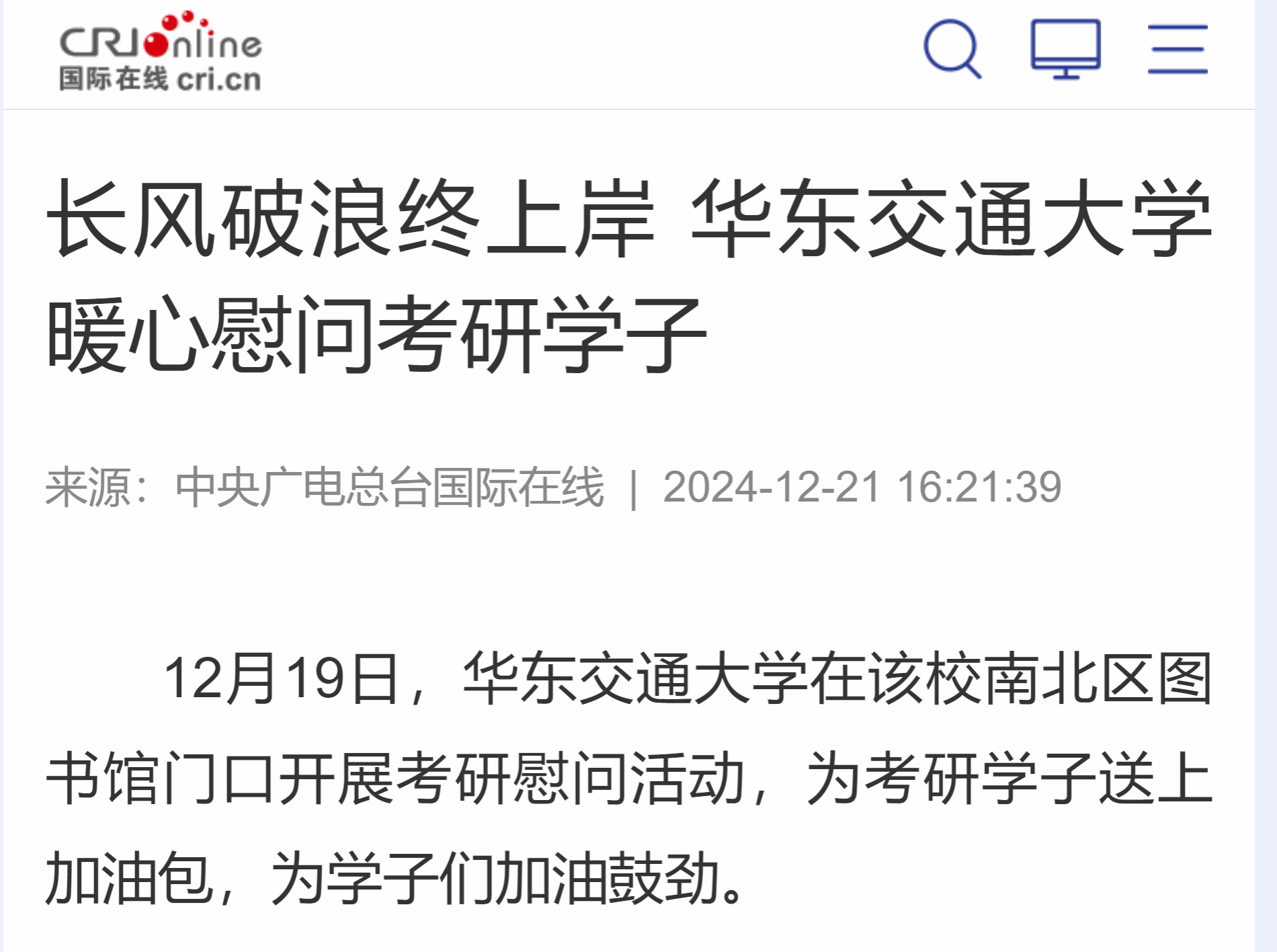 12月19日,華東交通大學在該校南北區(qū)圖書館門口開展考研慰問活動,為考研學子送上加油包,為學子們加油鼓勁。