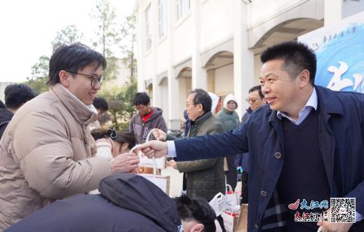 該校黨委書記柳和生為考研學子送上考研加油包。