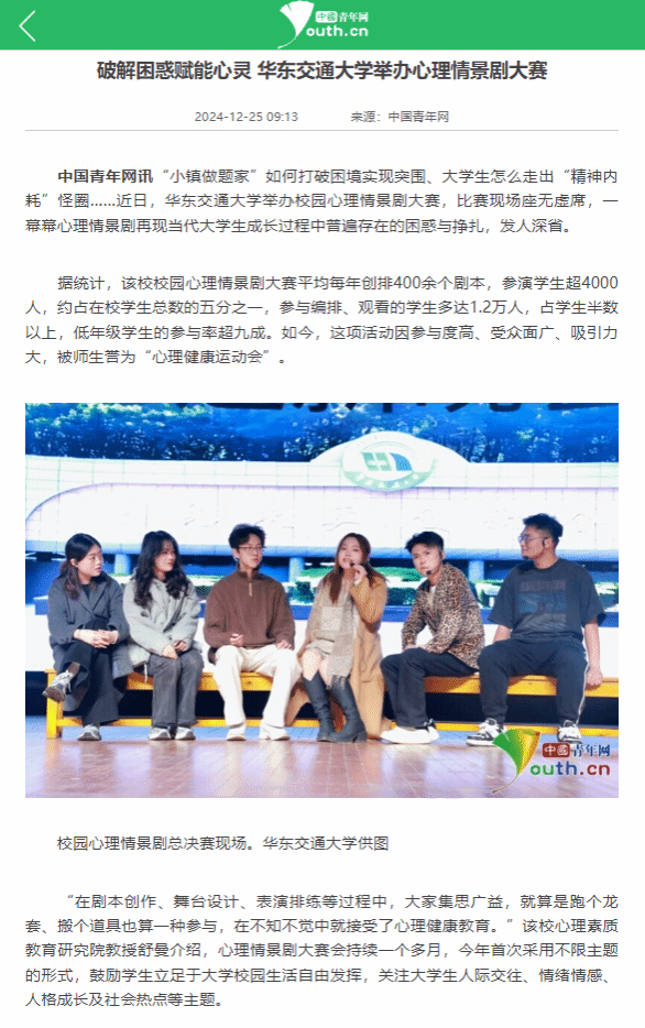 “小鎮(zhèn)做題家”如何打破困境實(shí)現(xiàn)突圍、大學(xué)生怎么走出“精神內(nèi)耗”怪圈……近日,華東交通大學(xué)舉辦校園心理情景劇大賽,比賽現(xiàn)場座無虛席,一幕幕心理情景劇再現(xiàn)當(dāng)代大學(xué)生成長過程中普遍存在的困惑與掙扎,發(fā)人深省。