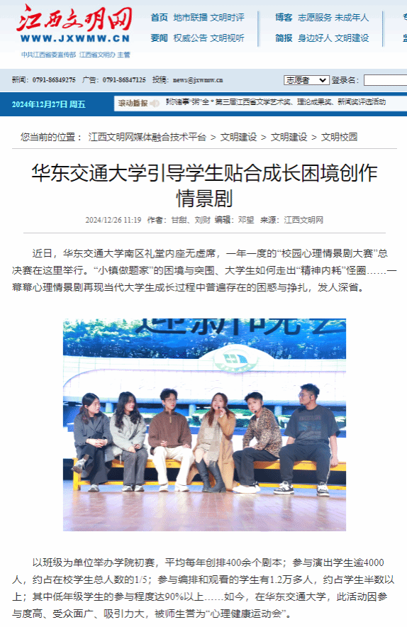 以班級為單位舉辦學院初賽,平均每年創排400余個劇本;參與演出學生逾4000人,約占在校學生總人數的1/5;參與編排和觀看的學生有1.2萬多人,約占學生半數以上;其中低年級學生的參與程度達90%以上……如今,在華東交通大學,此活動因參與度高、受眾面廣、吸引力大,被師生譽為“心理健康運動會”。