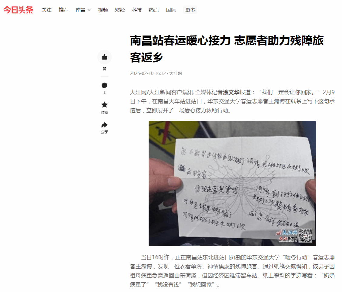當(dāng)日16時(shí)許,正在南昌站東北進(jìn)站口執(zhí)勤的華東交通大學(xué)“暖冬行動(dòng)”春運(yùn)志愿者王瀚博,發(fā)現(xiàn)一位衣著單薄、神情焦慮的殘障旅客。通過紙筆交流得知,該男子因祖母病重急需返回山東菏澤,但因經(jīng)濟(jì)困難滯留車站。紙上歪斜的字跡寫著:“奶奶病重了”“我沒有錢”“我想回家”。
