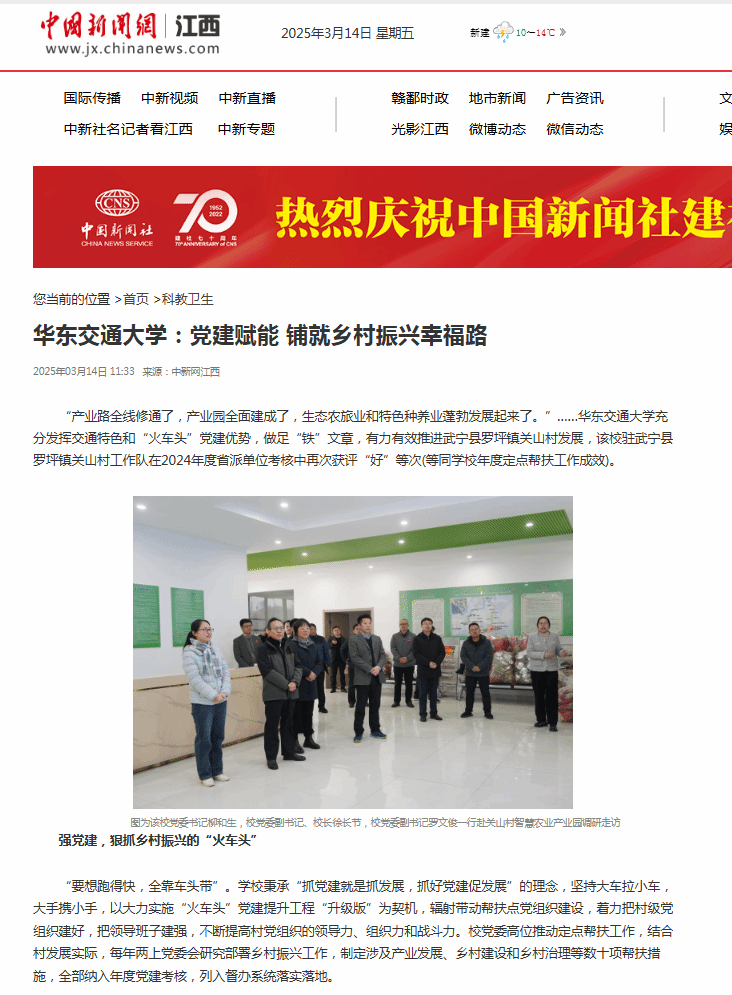 “產業路全線修通了,產業園全面建成了,生態農旅業和特色種養業蓬勃發展起來了。”……華東交通大學充分發揮交通特色和“火車頭”黨建優勢,做足“鐵”文章,有力有效推進武寧縣羅坪鎮關山村發展,該校駐武寧縣羅坪鎮關山村工作隊在2024年度省派單位考核中再次獲評“好”等次(等同學校年度定點幫扶工作成效)。