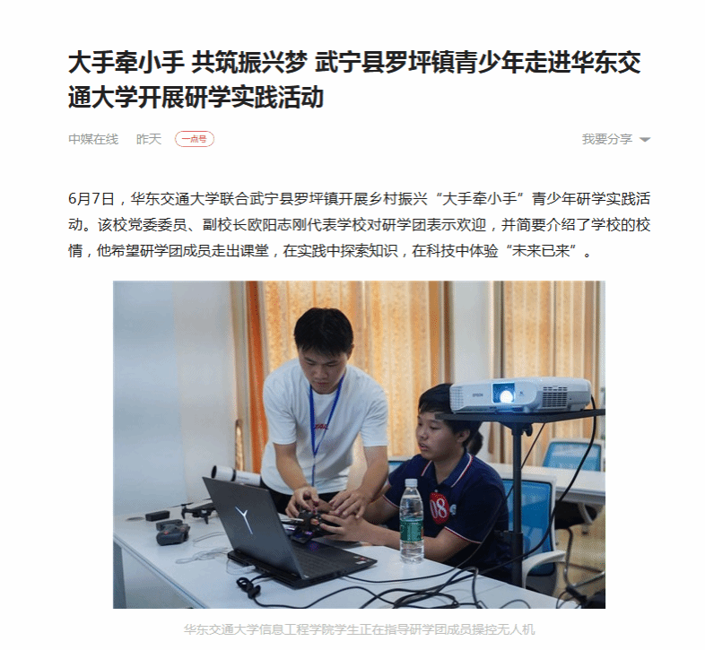此次研學活動是華東交通大學助力鄉(xiāng)村振興的重要舉措,未來該校將繼續(xù)豐富研學內(nèi)容,為青少年打造更具科技感和時代性的研學項目,讓學生在實踐課堂中,不斷拓寬視野,實現(xiàn)全面發(fā)展。( 圖/宋雨凡)